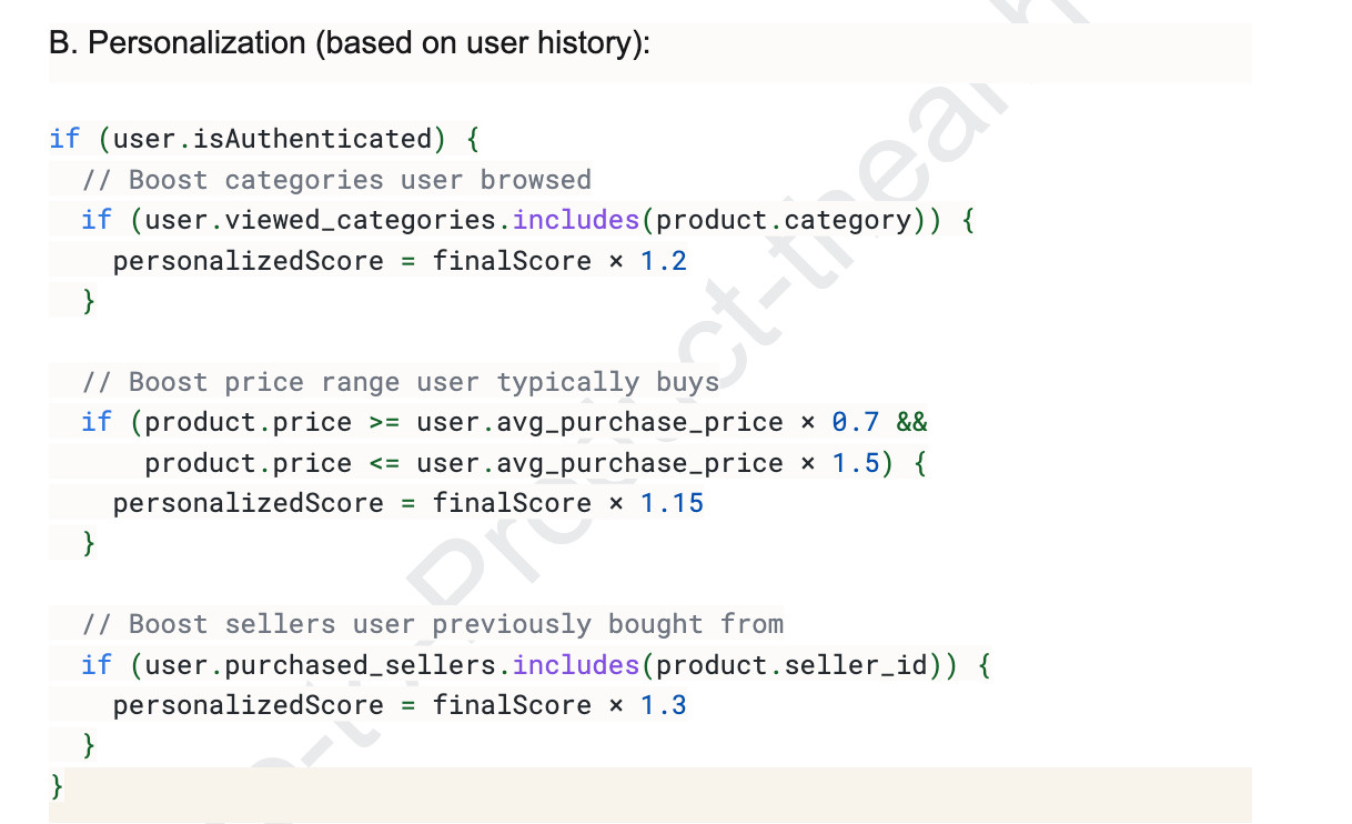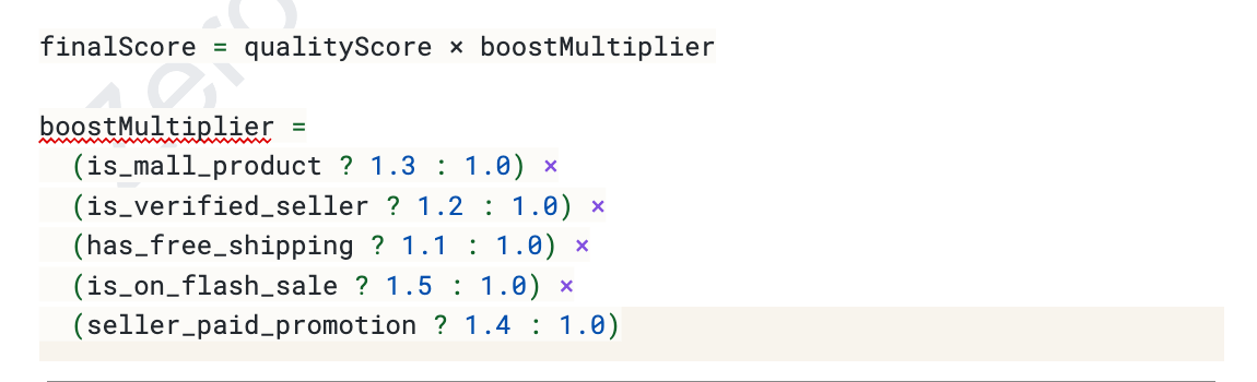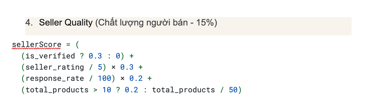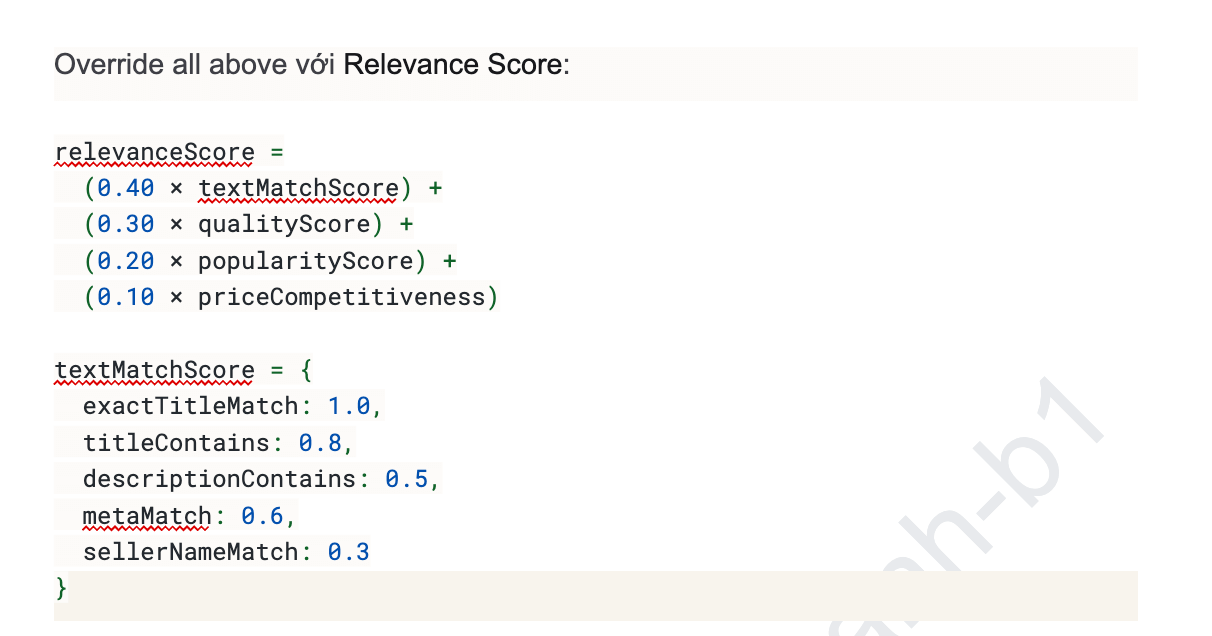 Relevance Score = 0.4 × Text Match + 0.3 × Quality + 0.2 × Popularity + 0.1 × Price Competitiveness
